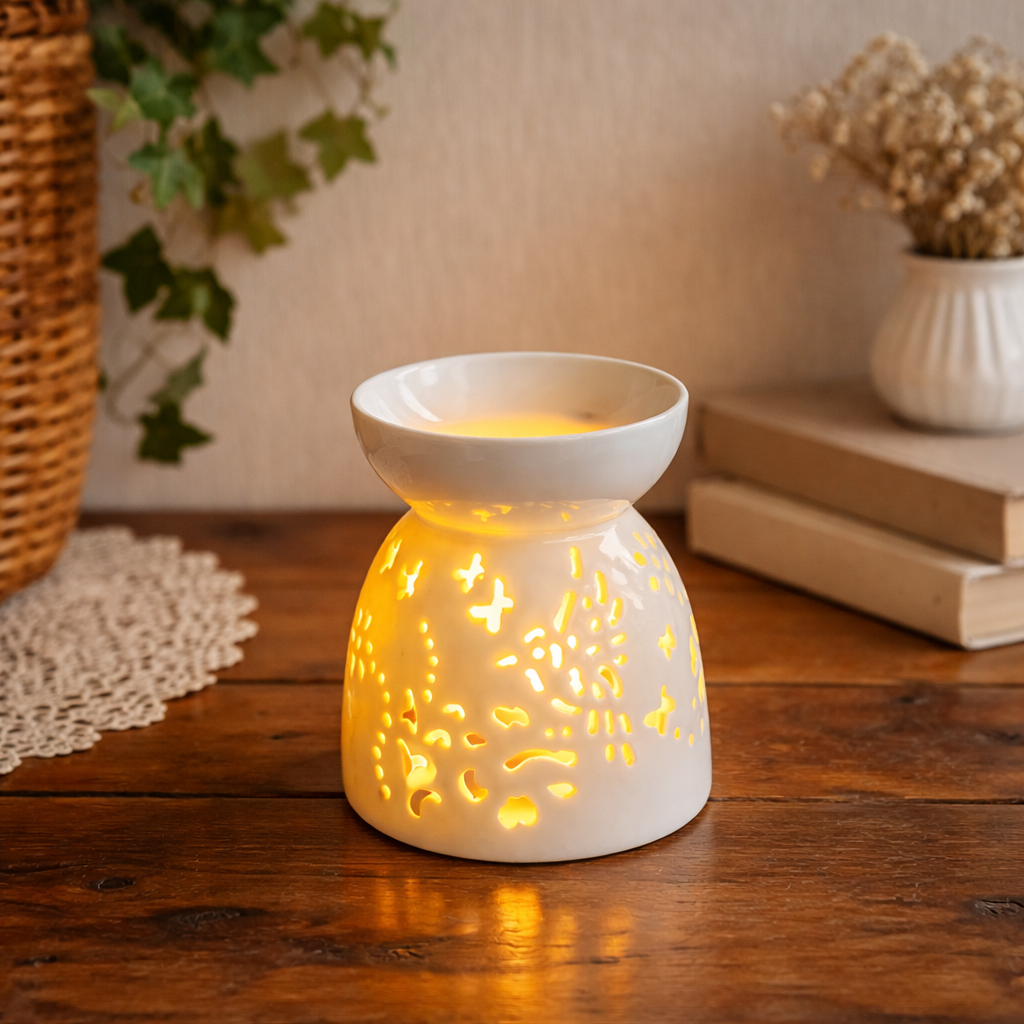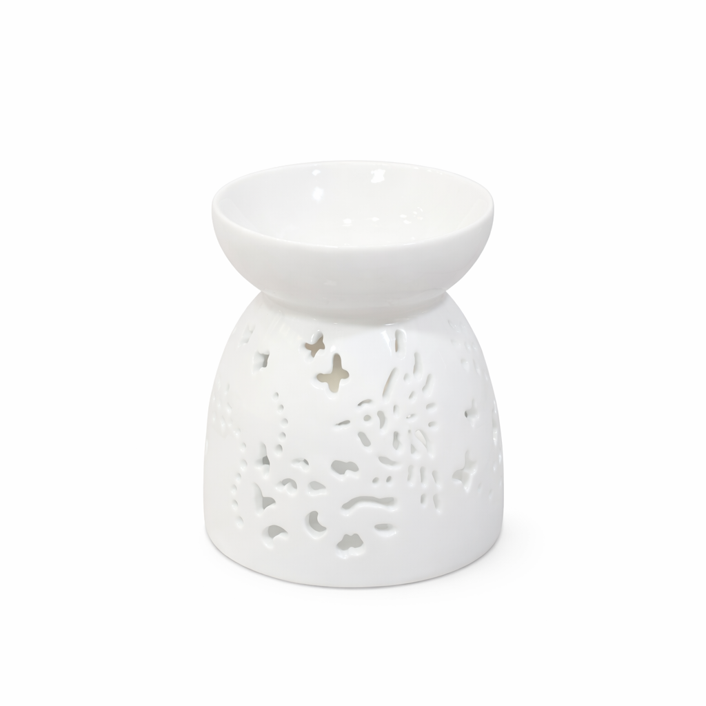 Aroomilamp ühendab endas lihtsa ja elegantse sisustuselemendi ning praktilise kasutuse. Portselanist valmistatud lamp on kaunistatud õrnade dekoratiivsete lõigetega, mis lasevad küünlaleegil kaunilt läbi kumada ning loovad ruumi pehme valguse. Ülemises kausis võib kasutada aroomivaha (ilma veeta) või vett koos eeterlike või aroomiõlidega. Lambi alumises osas asub koht teeküünlale, mille soojus hakkab kausis olevat vett või vaha õrnalt kuumutama. Soojuse toimel vabanevad meeldivad aroomid, mis täidavad ruumi ning loovad lõõgastava, hubase ja rahuliku atmosfääri.