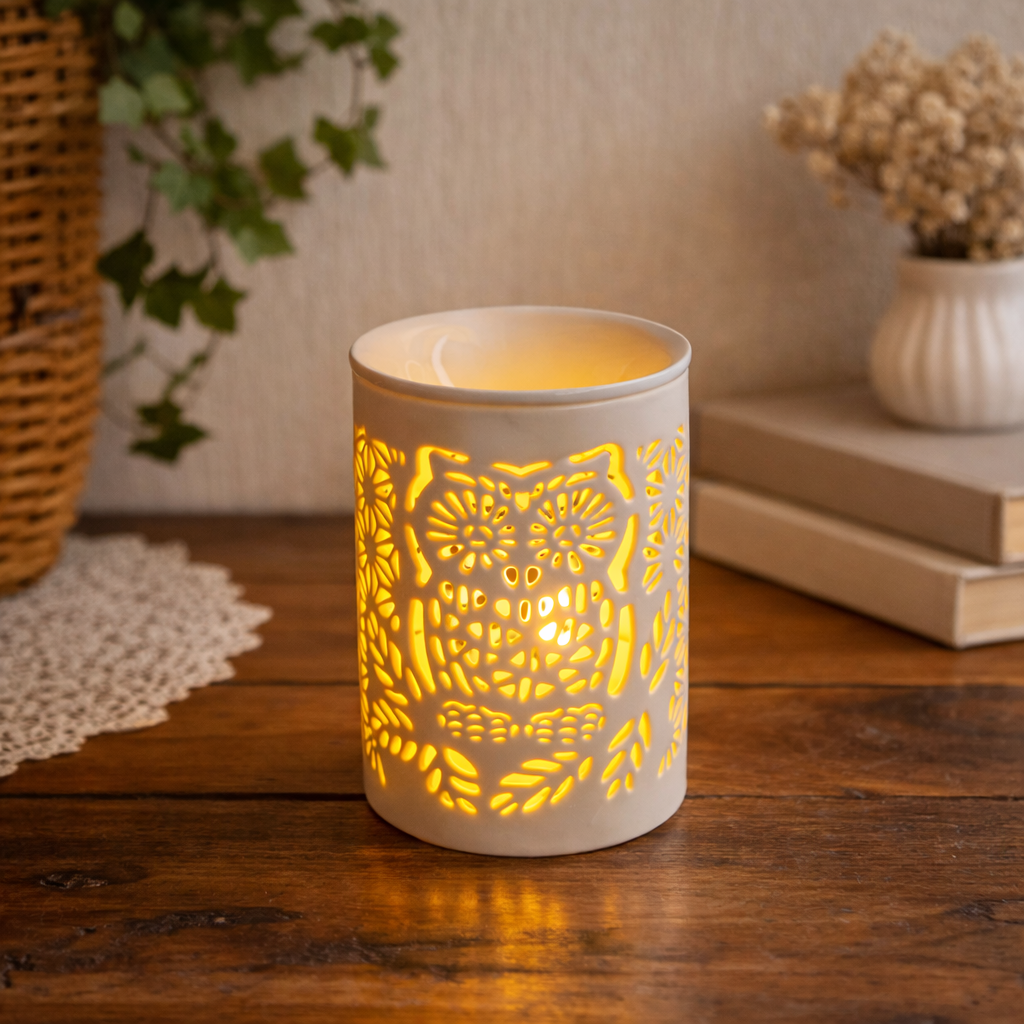 Elegantne portselanist aroomilamp dekoratiivsete mustrilõigetega. Sobib eeterlike õlide, aroomiõlide ja aroomivaha kasutamiseks ning loob ruumi hubase ja rahustava atmosfääri.