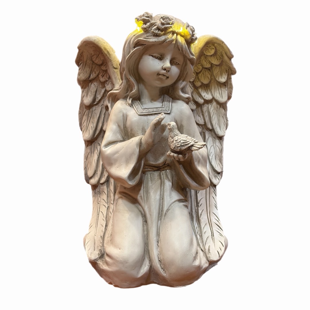 Kaunis polüresiinist valmistatud põlvitav inglikuju, mille peas on LED-tuledega valgustatud lillepärg. Pärja valgustus töötab kolme AAA-patareiga (ei kuulu komplekti), mis on mugavalt vahetatavad. Dekoratsioon sobib ideaalselt nii kodu sisustamiseks, jõulude ja pühade kaunistuseks kui ka mälestusnurka.