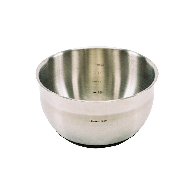 3-liitrine roostevabast terasest kauss kummeeritud põhjaga on praktiline ja usaldusväärne köögitarvik, mis püsib töölaual kindlalt paigal ega libise kasutamise ajal. Kõrgekvaliteediline teras on vastupidav, ei võta lõhnu külge ja sobib nii toidu valmistamiseks, serveerimiseks kui ka hoidmiseks. Kerge, kuid tugev kauss on suurepärane abiline salatite segamisel, taigna valmistamisel, marjade pesemisel või toidu ettevalmistamisel.