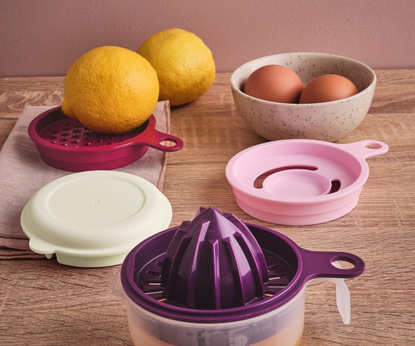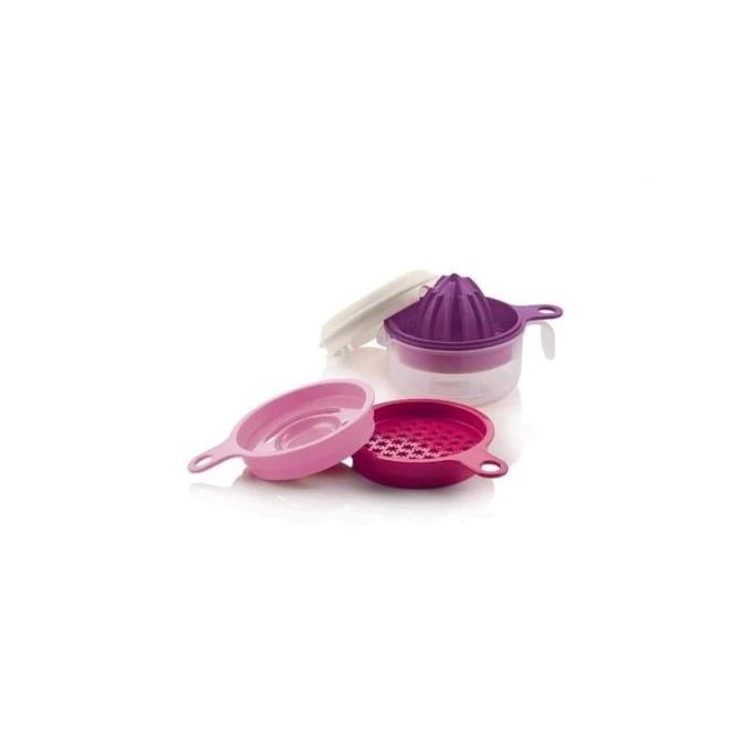 - 5-osaline komplekt : sisaldab 200 ml tassi, tihedalt suletavat kaant, riivi, munaeraldajat ja mahlapressi.