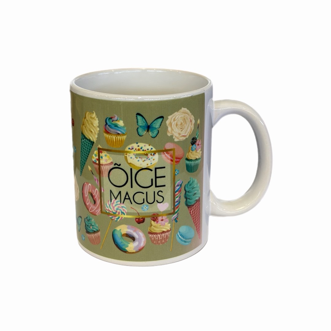 Vahva ja värviküllase maiustuste mustriga kruus kirjega “ÕIGE MAGUS” toob igasse päeva rõõmu ja mängulisust. See on ideaalne valik nii kinkimiseks kui ka igapäevaseks tee- või kohvipausiks. Keraamiline kruus on vastupidav, sileda glasuuriga ja mugava käepidemega, mistõttu on seda mugav kasutada ja lihtne puhastada. Sobib nõudepesumasinasse.