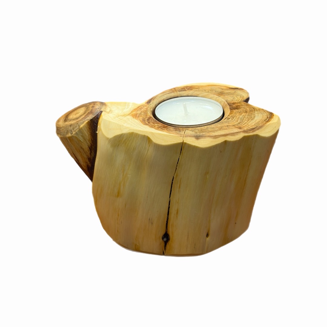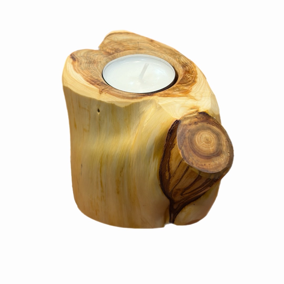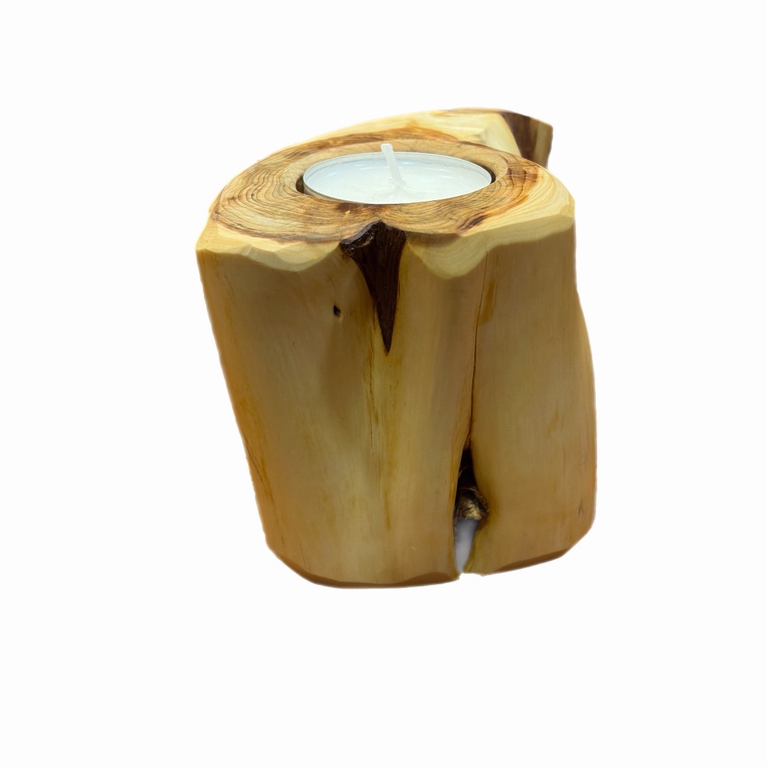 Käsitööna valmistatud kadakapuidust küünlahoidja, millel on looduslik muster ja meeldiv soe toon. Kuna tegemist on 100% loodusliku materjaliga, muudavad iga oksakoht, kooretükk või väike pragu küünlahoidja veelgi omanäolisemaks. Iga toode on oma kuju ja välimuse poolest täiesti unikaalne. Sobib teeküünlale ja loob ruumis hubase meeleolu. Kaunis ja praktiline sisustuselement ning hea kingiidee. Küünlahoidja on töödeldud puiduvahaga. Teeküünal kuulub komplekti.