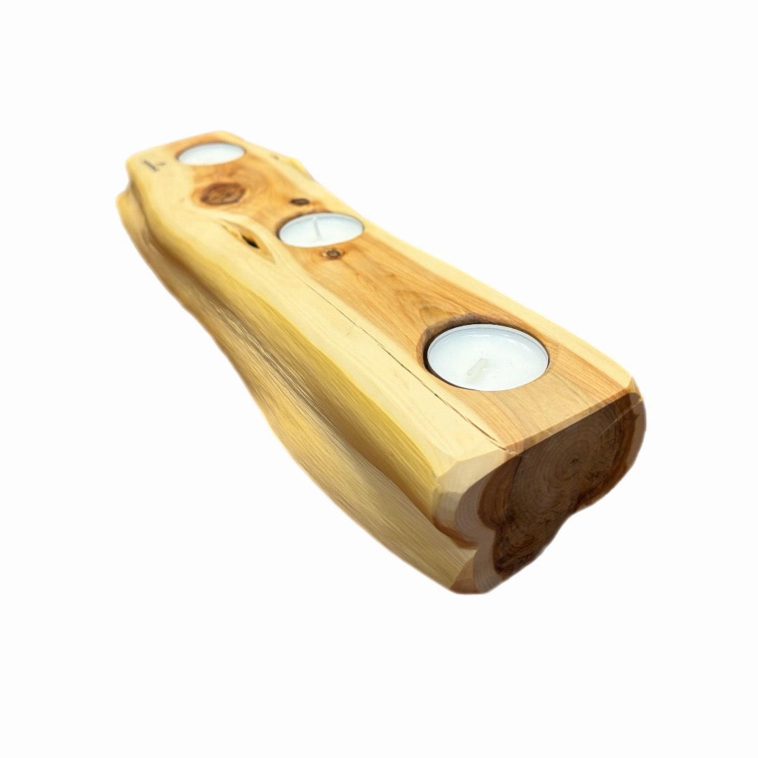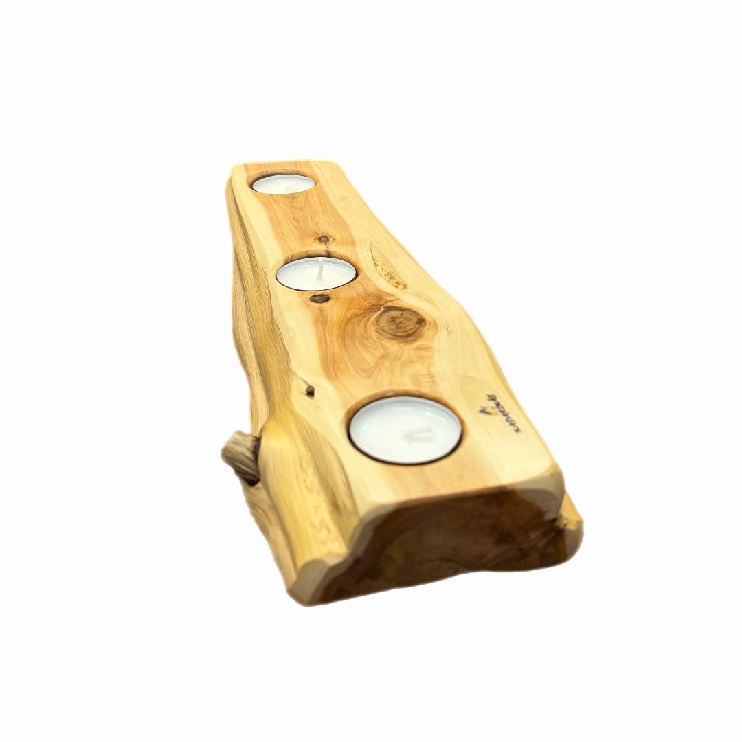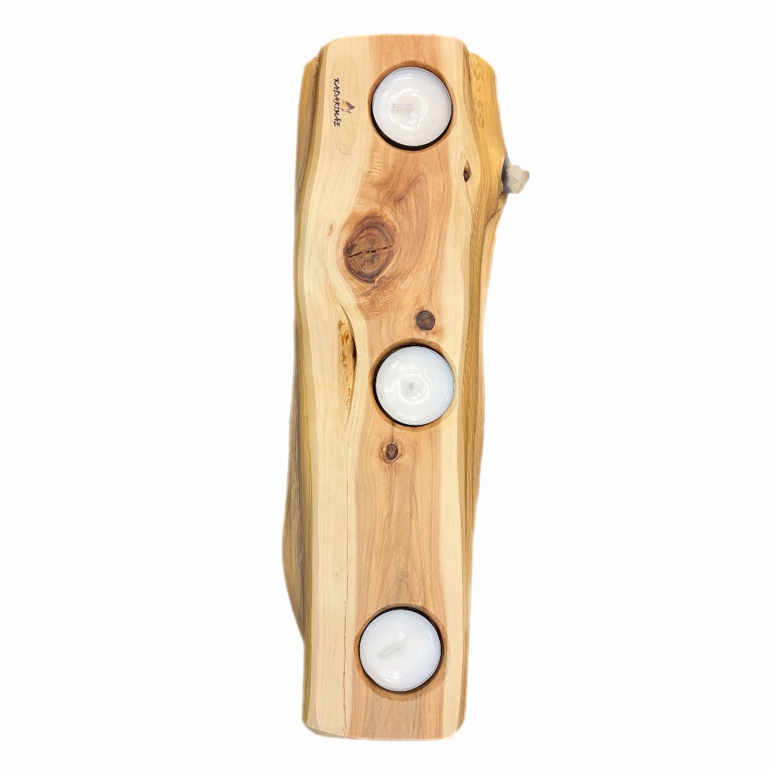 Käsitööna valmistatud kadakapuidust küünlahoidja, millel on looduslik muster ja meeldiv soe toon. Kuna tegemist on 100% loodusliku materjaliga, muudavad iga oksakoht, kooretükk või väike pragu küünlahoidja veelgi omanäolisemaks. Iga toode on oma kuju ja välimuse poolest täiesti unikaalne. Sobib teeküünaldele ja loob ruumis hubase meeleolu. Kaunis ja praktiline sisustuselement ning hea kingiidee. Küünlahoidja on töödeldud puiduvahaga. Teeküünlad kuuluvad komplekti.