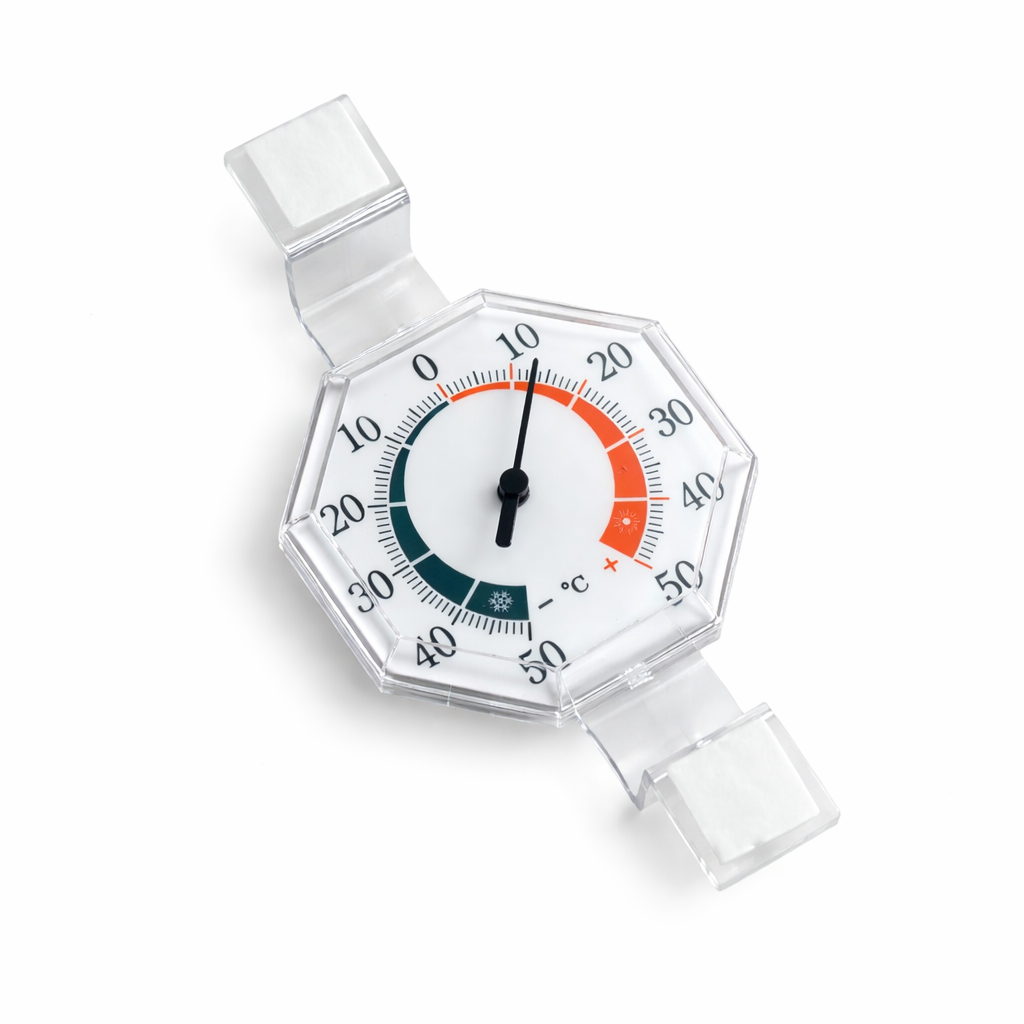 Plastikust välitermomeeter aknale on lihtne ja praktiline lahendus välistemperatuuri jälgimiseks otse siseruumist. Termomeeter kinnitub aknaklaasile kleebitavate kinnitustega ning võimaldab temperatuuri mugavalt lugeda ilma akent avamata. Selge ja suurte numbritega temperatuuriskaala tagab hea loetavuse igal aastaajal. Kompaktne disain sobib hästi igale aknale ning ei sega vaadet.