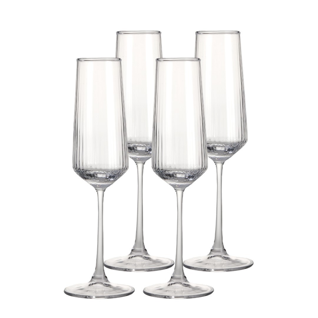 Šampanjaklaaside komplekt – ajatu ja praktiline valik. Komplektis on neli peenikese, kergelt kitseneva kujuga klaasi, mille õrn laineline pind annab neile elegantse ilme, täiendades iga interjööri. Klaasid sobivad suurepäraselt nii igapäevaseks kasutamiseks kui ka pidulikumateks koosviibimisteks. Valmistatud kvaliteetsest klaasist ja pestavad nõudepesumasinas.